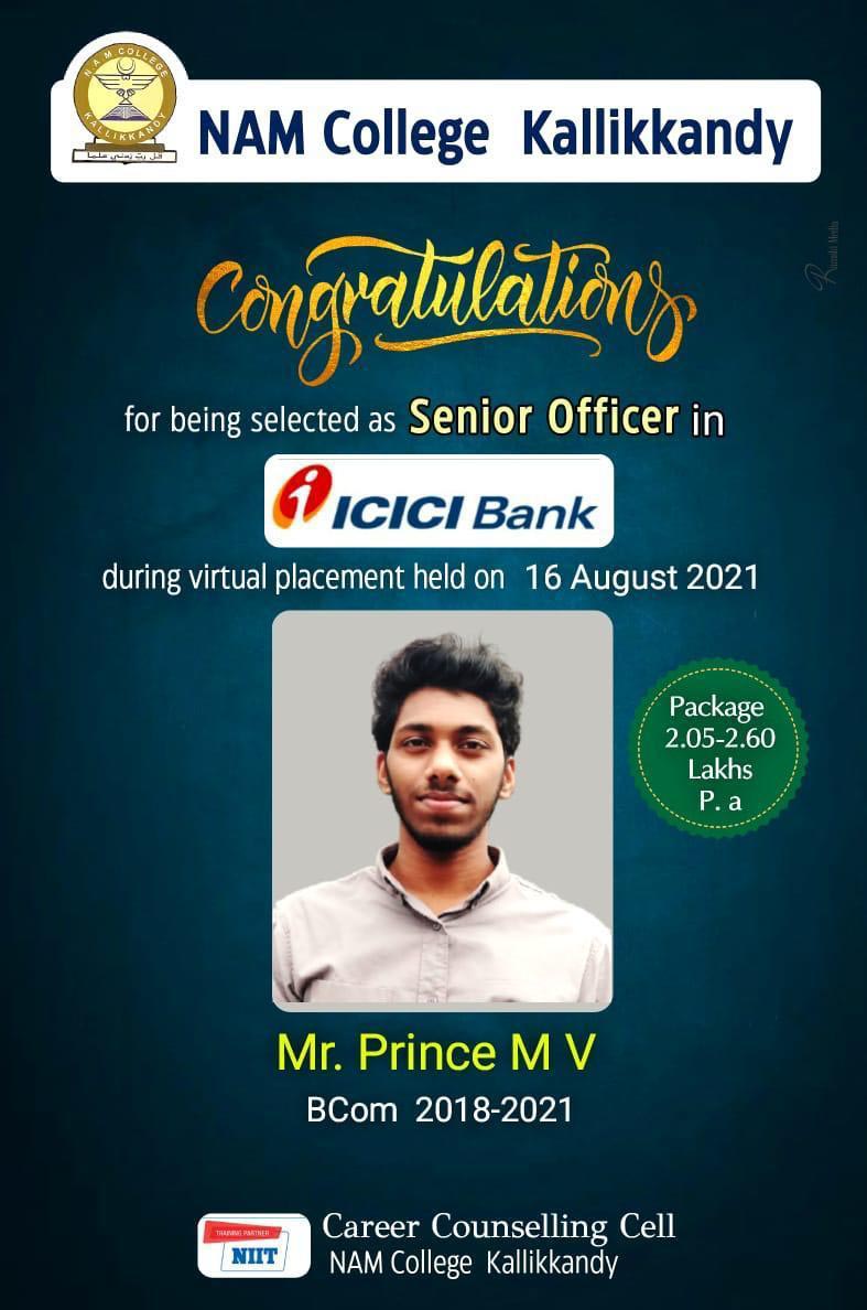 •     On 16-08-21 Career Guidance Cell, NAM College Kallikkandy in collaboration with IQAC, Organized a virtual Recruitment Drive for ICICI Bank. Students of different departments have attended the programme. Mr . Prince M.V (B.Com 2021) got selected for the posititon of senior officer in ICICI with a package of 2.05-2.60 lakhs per annuam.
