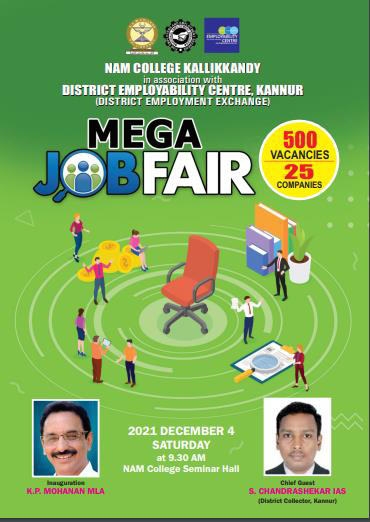 •     Career Guidance Cell, NAM College Kallikkandy in association with District Employability Centre, Kannur & Alumni Association Organized a job fair on 04-12-2021. 28 leading employers including Aster MIMS, PARCO, Milma, Wonderla participated in the recruitment process. Around 900 candidates turned up for the Job Fair, of which 96 were selected to various companies. Many candidates were short listed for the next round selction process. The event was a huge success. Managing Committee of the College took a great initiative in connecting prospective empoyees with employers through this event. The official inauguartyion session began with a Welcome Speech of Dr. Muhammed Kutty KK, Pricipal. This was followewd by the inauguartion by Mr.KP Mohanan MLA. Mr Rameshan Kuniyil, District Empolyment Officer In charge presided over the function. The key note address was given by Sri,Chandrashekhar IAS (District Collector,Kannur). Dr MK Madhusoodanan delivered on introducing speech. The programme was felicitated by Dr. Majeesh T and Sameer Parambath Mr. Arif MK, Career Guidance Cell Cordinator proposed the vote of thanks.