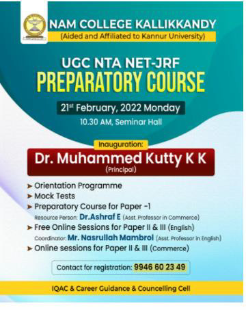 •     Career Guidance Cell in collaboration with IQAC took initiative to organize Preparatory Course for UGC NTA NET – JRF Examination. The course included orientation programme, Mock Test, Coaching classes for Paper – I and online session for Paper II (English and Commerce). Dr Ashraf E taught lesson for Paper – I. Mr Nasrulla, Department of English, provided materials for Paper – II (English). The Post Graduate Students of different department were the beneficieries of the course.