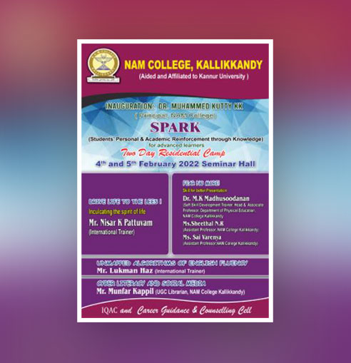 As a part of SPARK, two day residential camp was organized at NAM College campus on 4th and 5th Feb 2022. More than 50 students attended the programme. 4 session were held in the two day camp. First session on ‘Better Presentation ‘ was done by Dr. MK Madhusoodhanan, HOD of Physical Education. Ms Sheethal, Ms Sai Varenya, Asst Professor in English were also handled the session. Mr Nisar K Pattuvam was the resource person of the second session. He led a session on Incalculating spirit of Life.