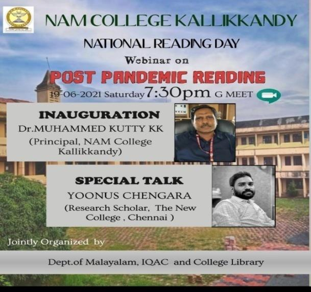 NAM College kallikkandy has celebrated the National Reading Day on 19th June 2021. The Programme was inaugurated by College Principal Dr. K K Muhammad Kutty. Mr. Yoonus Chengara, Reserch Scholar, Dept. of English, The New College, Chennai was the Chief Guest and delivered the keynote address on "Post Pandemic Reading". Anshi Sadananthan, student Dept. of Mathematics, delivered the welcome speech. Dr. Hussain, Asst. Professor, Dept. of Malayalam, presided over the function. Sri Muhammad Ismayil K M, Co ordinator-IQAC and Sri. Munfar Kappil, Librarian, felicitated the function. College students presented various programme. Mrs. Sona, student of Dept. of History, concluded the programme with her vote of thanks. The Reading Day Celebration-2021 was jointly organized by the Dept. of Malayalam, IQAC and College Library.