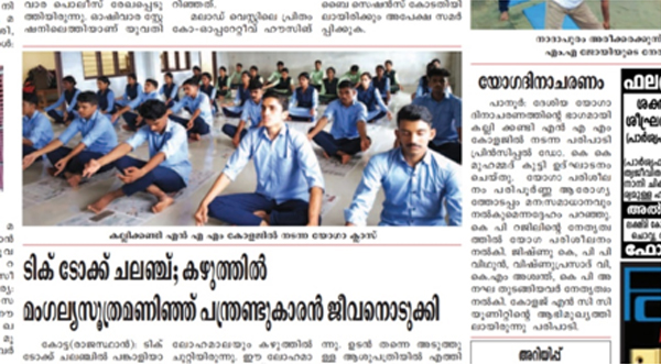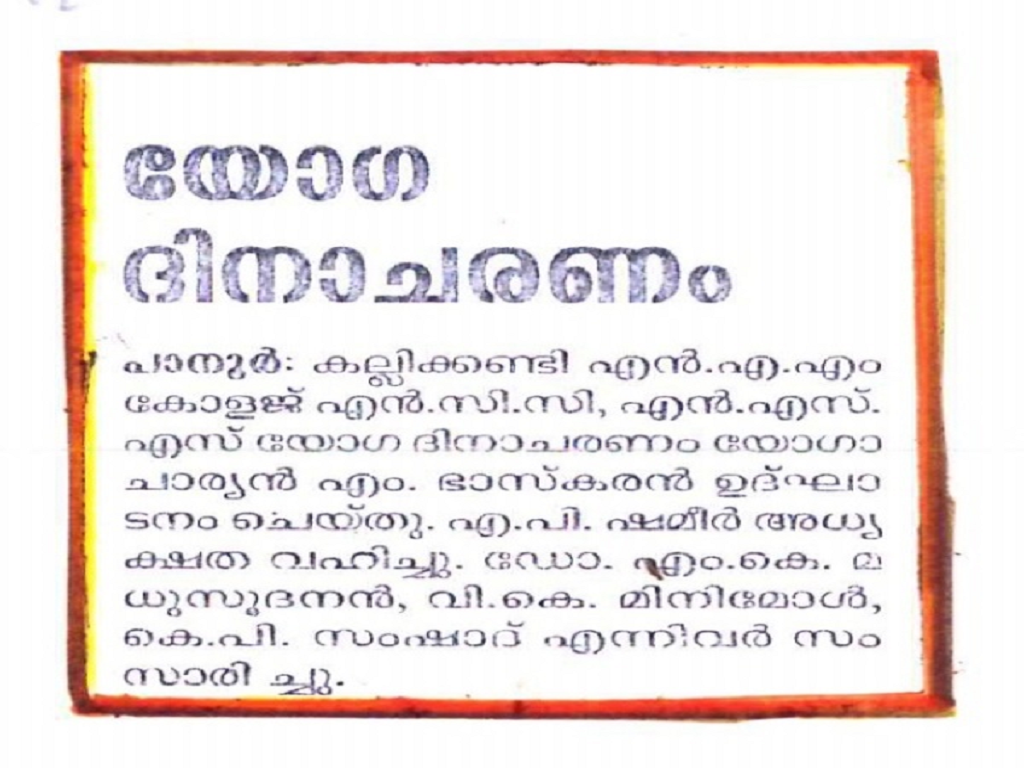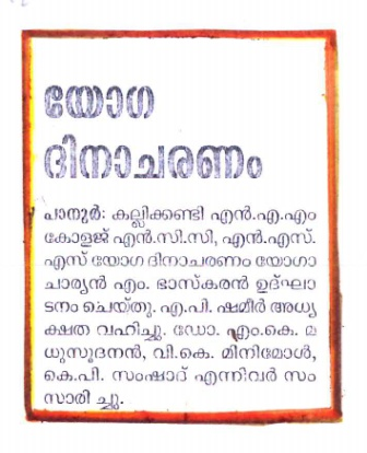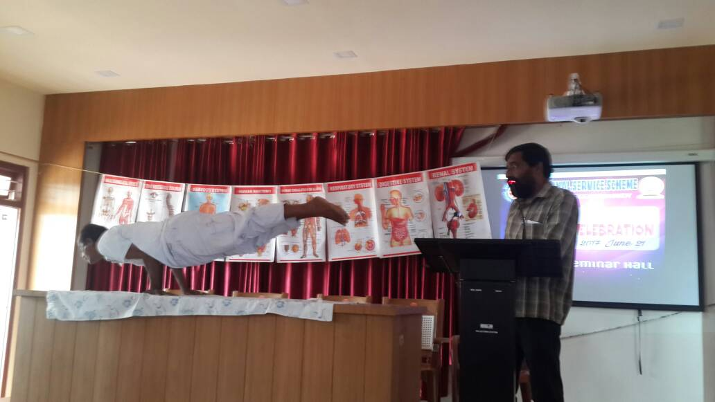 The NSS unit observed world yoga day by conducting yoga speech and practices in the college auditorium. The program started with an informative lecture on “What is Yoga and its Benefit to health” by Acharya Sanadhana Babu. He stressed the importance of yoga and appropriate diet to keep a healthy mind in a healthy body. He stated that a positive mind would create happy relations and a happy society. Dr KK. MUSTHAFA, The Principal Chaired the function. NAMSHAD.KP, Dr. M.K. Madhusoodhanan, LT. A.P. Shameer, Smt. Minimol V.K represented in the function. Volunteer Megha Sesendran delivered