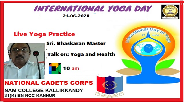 As part of International Yoga Day Celebration, NCC UNIT conducted one week yoga practice starting from 21- June 2020. Each day cadets practiced yoga from their house from 7’o clock to 8 am. The event was inaugurated by College Principal Dr K.K. Muhammed Kutty. Sri. K.P. Rajil gave leadership to the yoga practice.